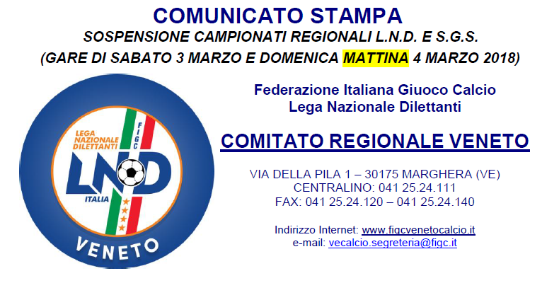 SOSPENSIONE CAMPIONATI REGIONALI e PROVINCIALI L.N.D. E S.G.S. (GARE DI SABATO 3 MARZO E DOMENICA MATTINA 4 MARZO 2018)