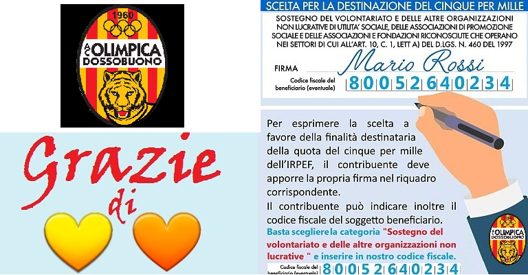 Il 5 X 1000 All’ ACD OLIMPICA DOSSOBUONO:Con la prossima Dichiarazione dei redditi sarà possibile donare il 5 X 1000 alla nostra associazione sportiva e quindi sostenere le attività rivolte ai nostri atleti.